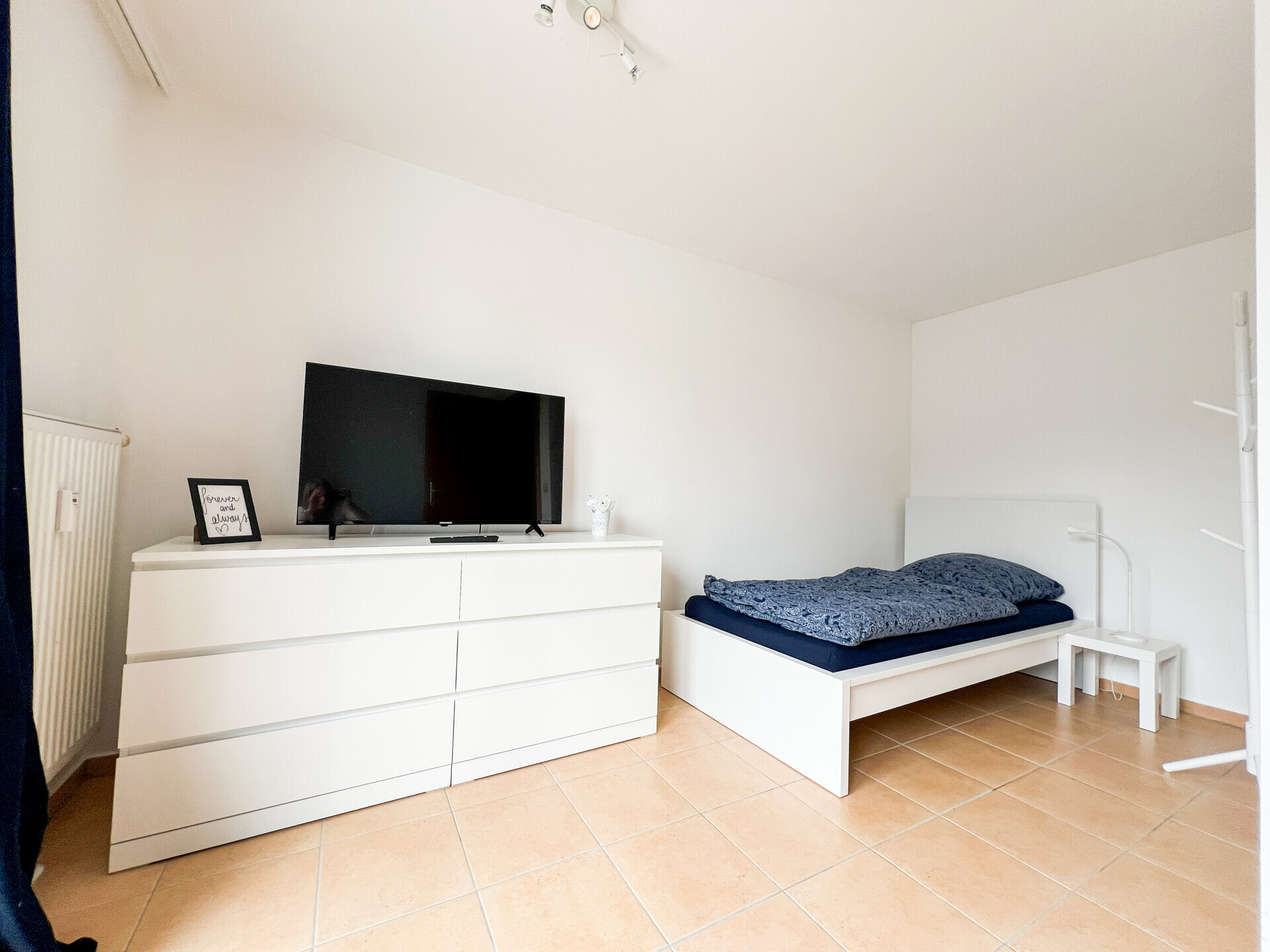Im 1. Obergeschoss befindet sich ein gemütliches Schlafzimmer und ein modernes Badezimmer mit Badewanne.