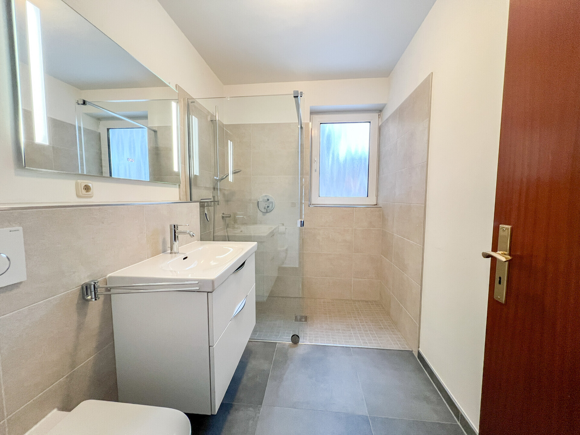 Waschtisch inkl. Unterschrank ausgestattet. Zusätzlich steht ein separates Gäste-WC zur Verfügung.